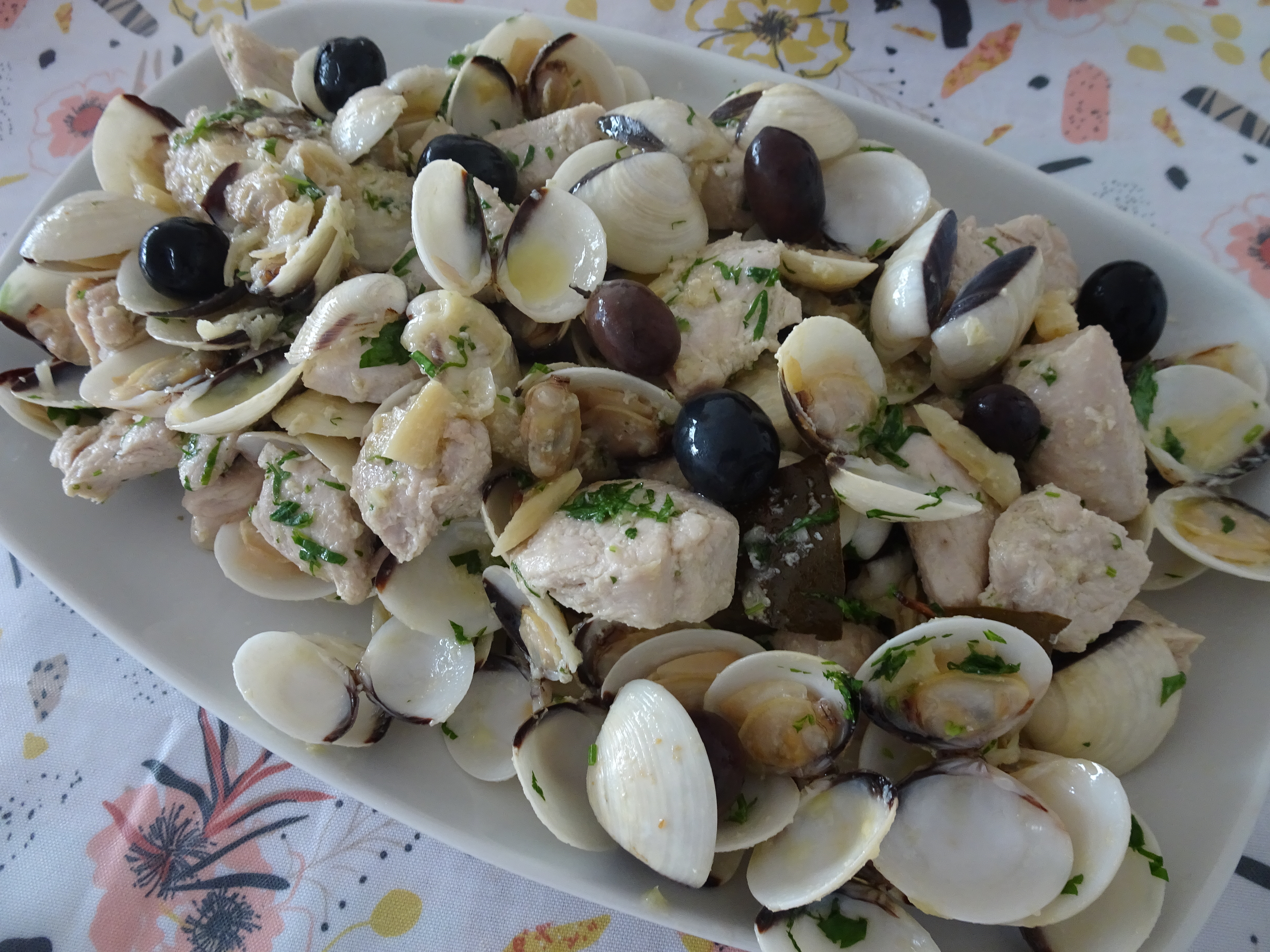- Deixe-as cozinhar e abrir. Quando abrirem junte novamente a carne, misture e polvilhe com salsa picada. Sirva com arroz ou batata a gosto. A nossa carne foi servida com batatas doce e batata branca às rodelas e aos quadrados, assada no forno e temperada com orégãos e sal, envolvida num fio de azeite. Foi assada no tabuleiro do forno forrado com papel vegetal.